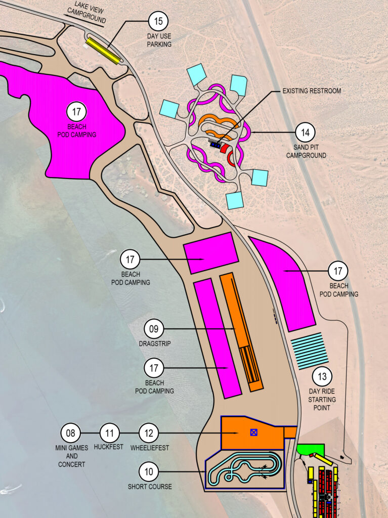 Area 17 can be accessed from Sand Hollow Road. Once participants arrive at the event gates, you will be greeted and guided to the Beach Pod camping area. We have created a staging concept that will accommodate fifteen 40’ trailers at any given time where participants can safely air down their trucks and trailers before entering the beach. There will be a dozer available in this area if needed. Participants will be asked to enter the beach under their vehicle’s power similar to any other weekend throughout the year. Our dedicated security team and dedicated traffic control team will be available throughout the event to offer assistance and answer any questions.