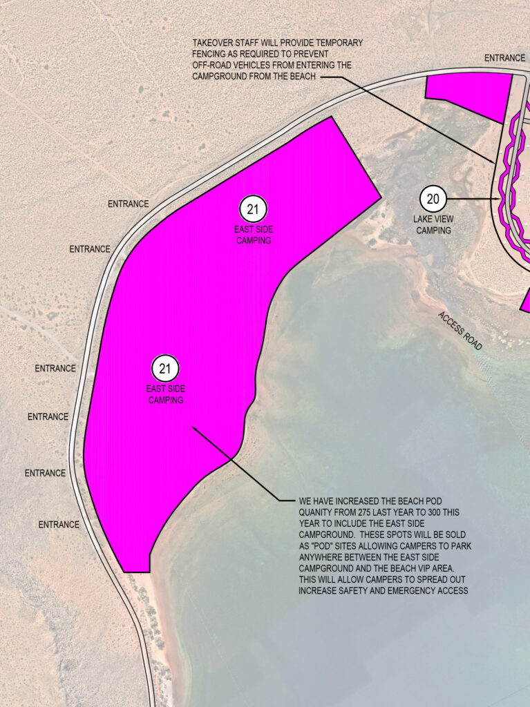 Area 21 is referred to as our East Pod Camping. We refer to a “East Pod” as a group of self-sufficient trailers camping overnight on the beach. The East Pod area is located just east of the Sandpit Campground at the end of Sand Hollow Road on the east side of the existing lake. This area is a mix of gravel and hard pack dirt. Its location is great for people looking to be near the lake but a little further from the main event area.
