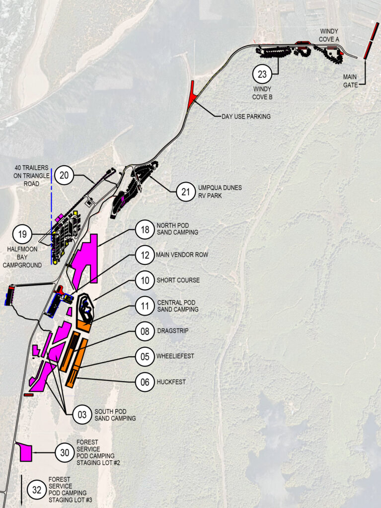 With such large numbers of people attending Takeover events, day-use parking and overnight camping can be very convenient but in limited supply. We recommend arriving early for a parking spot and/or camping on the dunes, where easy access to the event and direct dune access is easy any time of day. ALL camp spots sell out quickly so reserve as early as possible! Please note that ALL on-site campgrounds/spots are dry-camping and there are no dedicated potable/blackwater systems available on-site.